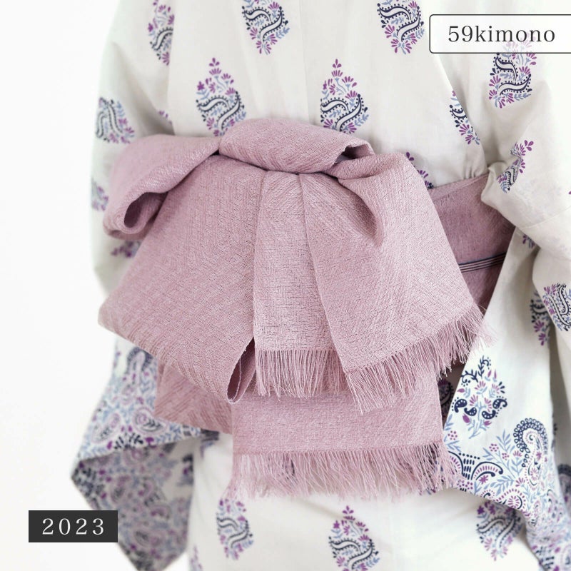 麻に加え、和紙を織り込んだ新しい素材の兵児帯です。 麻帯特有のガサガサした手ざわりが軽減され、ざっくりとした織ながら扱いやすい生地になっています。 幾何学模様の織柄もさりげない雰囲気を添えてくれます。 いろんな帯結びが楽しめる兵児帯なので、名古屋帯風にも半幅帯のようにも楽しめます。 色は、スモーキーなローズピンクカラーのサクラと、青みがかった紫のダークパープルの2色あります。