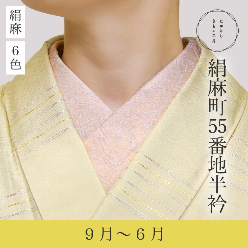 たかはしのオリジナル生地「絹麻」は、全く新しいカテゴリー。 麻を使ってはいますが、生地がしっかりしているのと、絹の印象があるので盛夏以外にお勧め。それでいて麻の涼しさはあるので、特に単衣の季節がピッタリです。 落ち着いた色合いとふっくらとした地紋用なので、寒い季節に付けてもしっくりきます。 一年のほとんどにご使用いただける「絹麻町55番地半衿」は、とりあえず一枚持っておくと、いざというときに便利です。