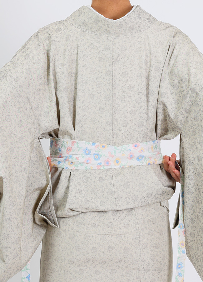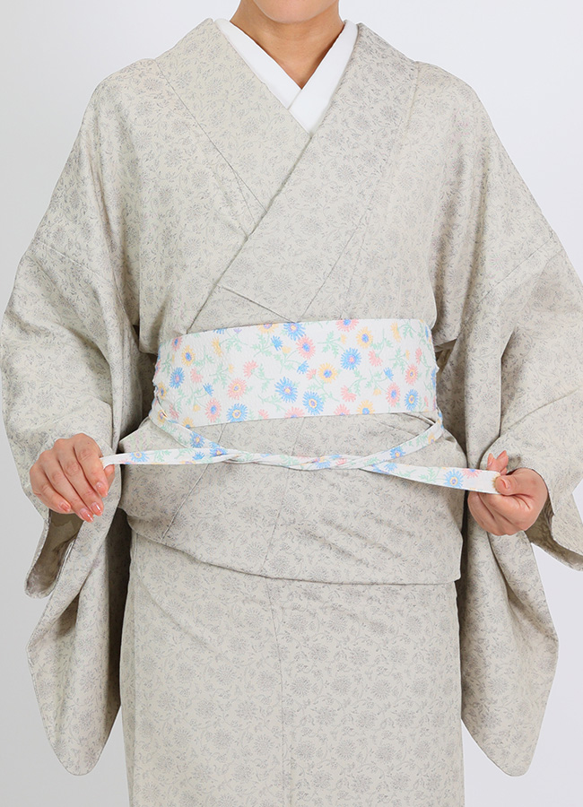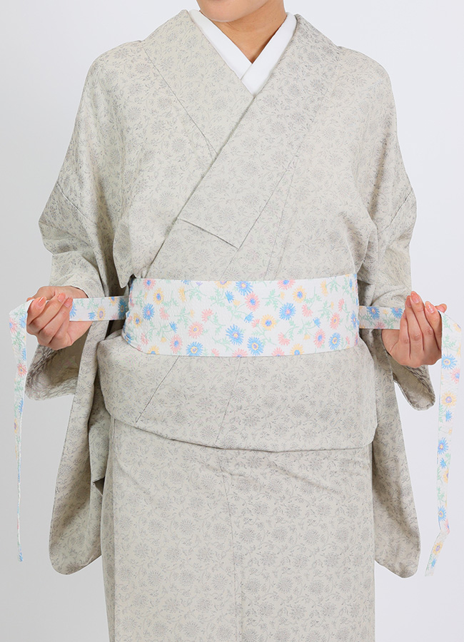 中央の幅広部分が、両端に向かってすっと細い紐状に変わっていく先細りのシルエット。これは、見た目のデザインではなく、着付けの"悩み"から生まれた機能的な答えです。