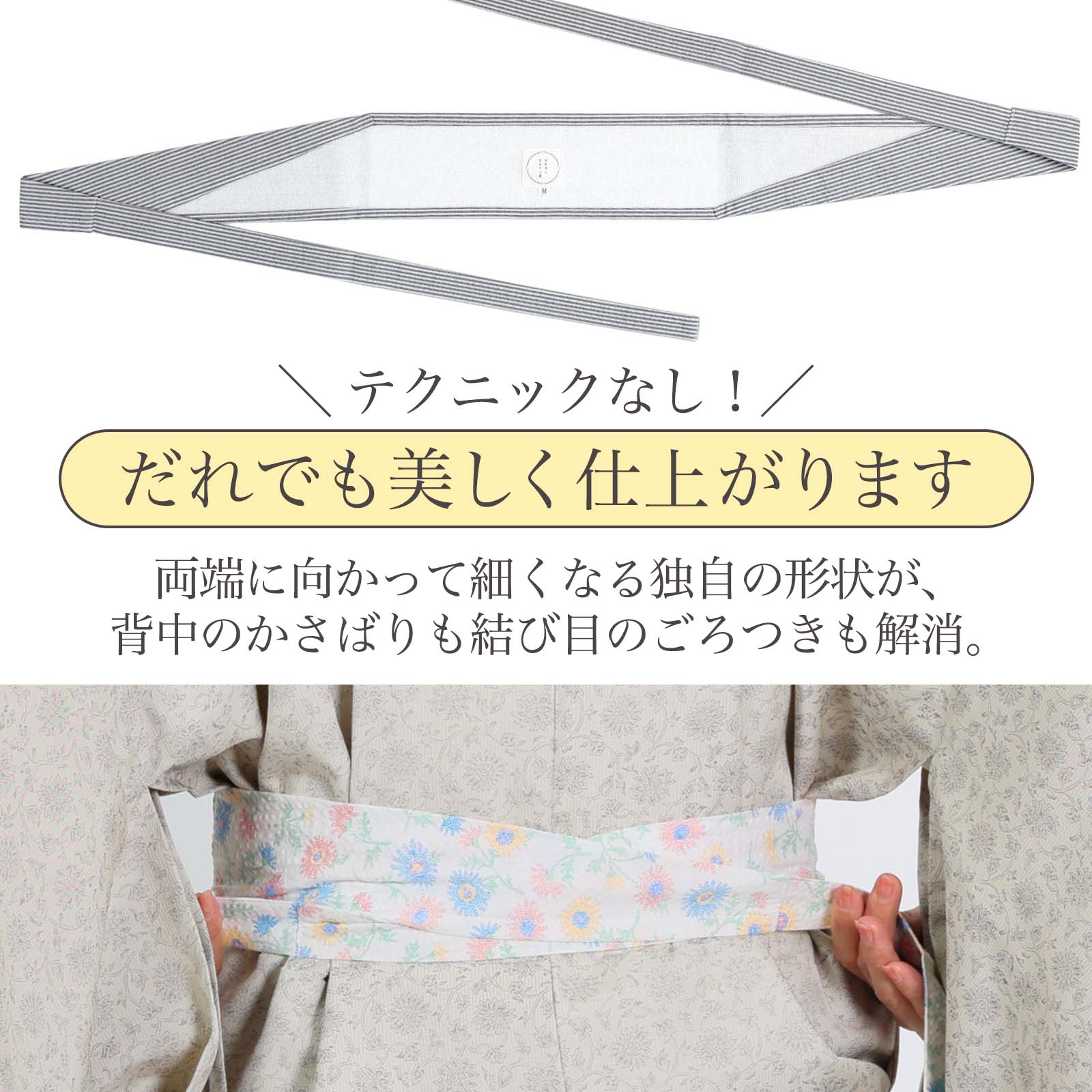 幅広の中央部分が胸元をしっかりと面で押さえ、細くなった両端は背中でクロスしてもかさばらず、前に持ってきた紐もすっきりと始末できます。従来の伊達締めのように背中で折り返す必要がなく、テクニック不要でだれでも美しく仕上がります。
